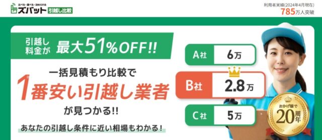 引越し一括見積もりサイト「ズバット引越し比較」は、おかげさまでサイト運営20周年突破!